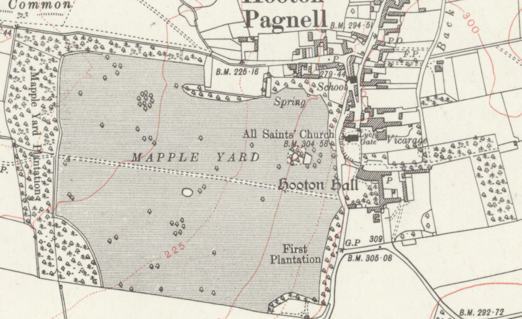 A map drawn of the estate as it was in 1260 (Ruston and Witney 1934, 56) shows this area as ‘Demesne’. In 1692, some of the northern part is described as waste ground prior to enclosures for several owners for improvement (ibid, 93). In the north east corner was Mappleyard, then an 11 acre plot. The enclosures of the Demesne can be seen in the Ruston and Witney estate map of 1780. In 1794 the Mapple Yard was converted to a park when the enclosures, Mappleyard, Upper Pond Close, Lower Pond Close and other small ones were combined to give an open area of 68 acres. From then there was considerable tree planting (ibid, 109) of shelter belts and clumps in an ‘English Landscape’ style (Klemperer 2010, 394). In the tithe map of 1847, the area is named as Park and listed as grass [pasture]. OS maps from 1891 onwards describe the area as ‘Mapple Yard’. Today it is now arable. In the south east corner of the park area there survives an early C20 graveyard and lychgate, the gift of Mrs Warde Aldam.