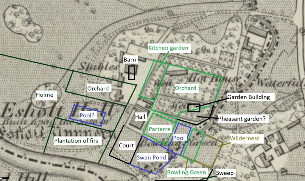 As the new hall had the same footprint as the old building, the overall layout was unchanged although new areas were made including formal parterre gardens to the south and east of the hall accessed by steps, a bowling green and small wilderness further east, together with a pond to attract swans (Figure 1). To the west a new orchard was added in the area known as the Holme. These formal gardens were still in place, with the possible exception of the wilderness by the late 1750s (Figure 6) but probably removed soon after and grassed over. The Swan pond was drained and the stream leading to it was diverted under the bowling green.
