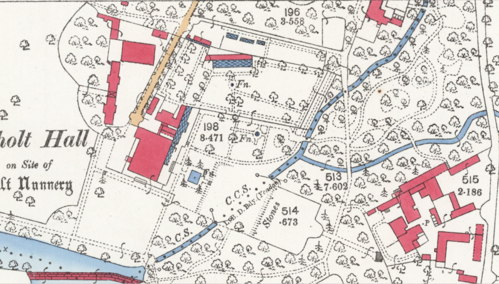 The priory buildings had a ‘small orchard’ in 1539, described as ‘the Convent orchard lying without the said wall of the East side of the house and is well paled round about’ (Brown 1886, 322) that probably was on the site of the later kitchen garden. There was a second separate orchard that a later survey of 1612 (WYASL WYL500/854) said covered 2r 30p and adjacent ‘Horse Coppice’ of 1a 1r 17p, probably to the north and east of the buildings.