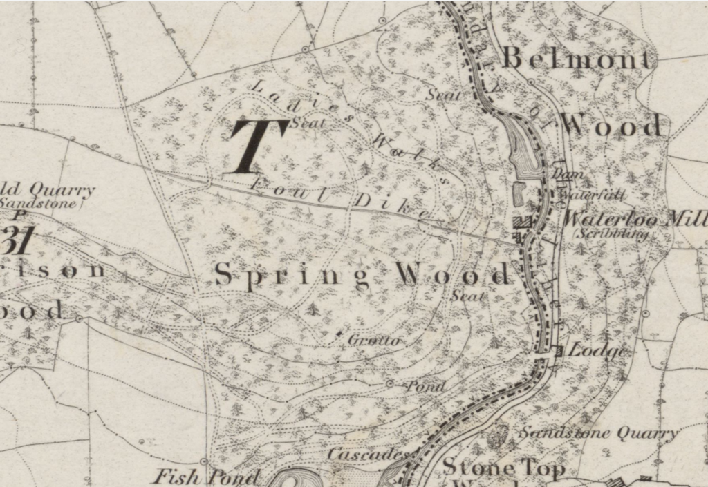 Figure 5 – Spring Wood pleasure grounds with walks, seats and grotto. Ordnance Survey 6” 1st edition, surveyed 1847-8, published 1851. National Library of Scotland CC-BY.