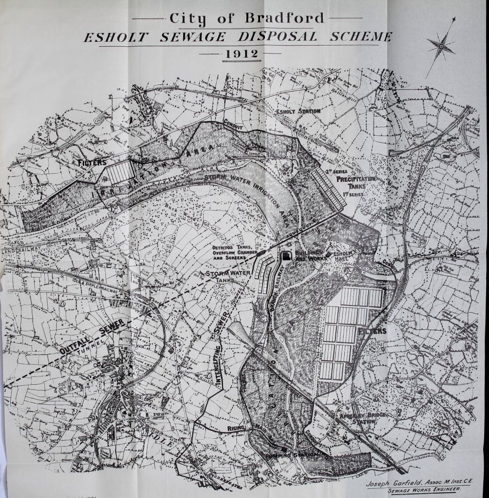 Figure 11 – Proposed sewerage works at Esholt from Bradford Corporation 1912. Esholt sewage disposal scheme. Bradford Corporation.